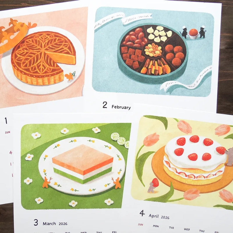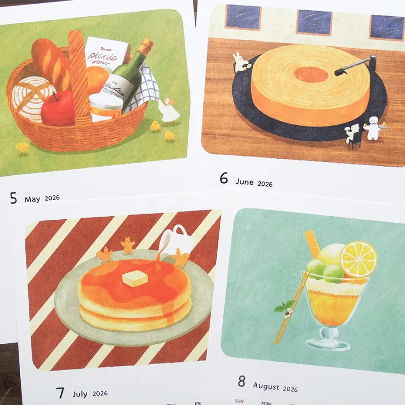 This year’s calendar is themed around charming sweets, paired with Mariko Fukuoka’s signature small animals with their wide, endearing eyes. Each month presents a colorful, whimsical illustration that feels both delicious and heartwarming — perfect for brightening your days throughout the year. A joyful choice for yourself or as a thoughtful gift.