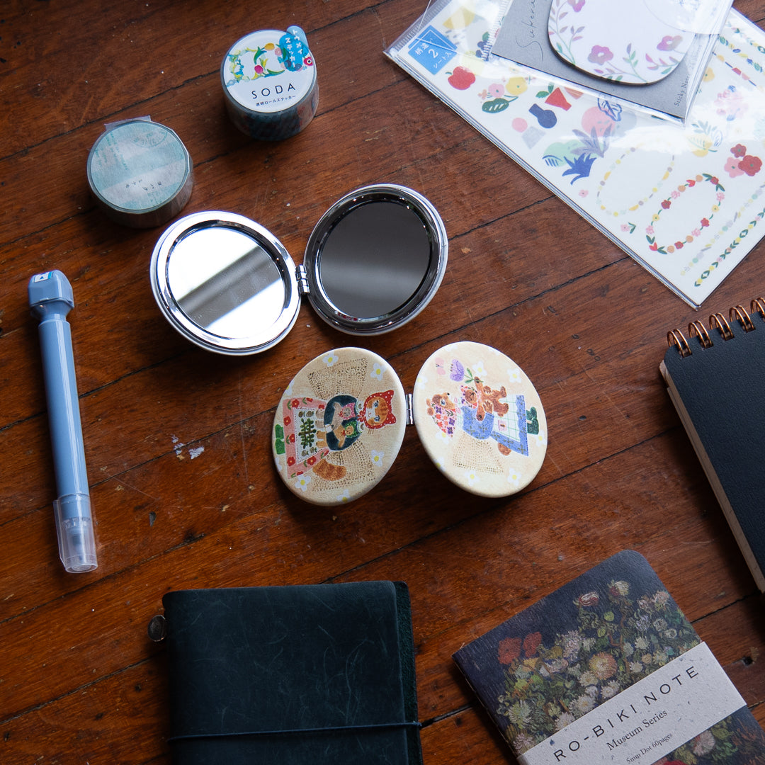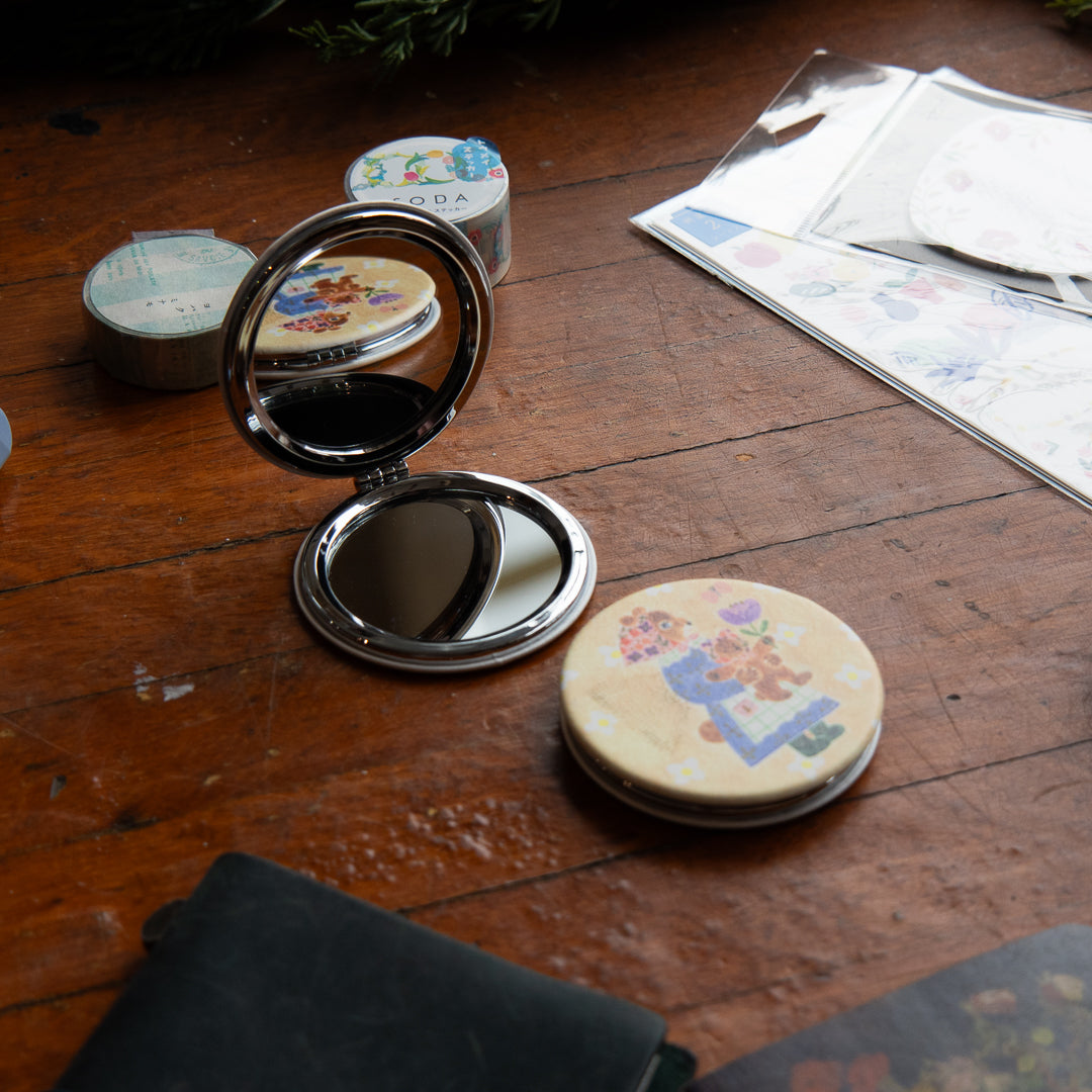 A charming compact mirror illustrated by Japanese artist Aiko Fukawa, featuring a pair of stylish figures holding teddy bears, each wearing matching hoods. The illustration appears on both sides of the mirror, creating a sweet, storybook-like feeling that’s full of gentle charm. It’s the kind of piece that makes you smile every time you pull it from your bag.