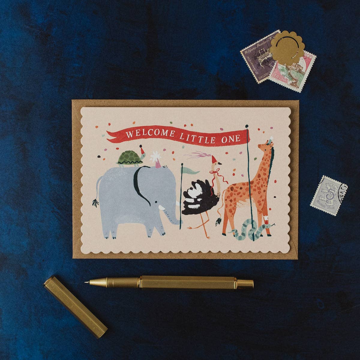 It's a parade! A menagerie of animals have turned out to say hello to a new baby, parading across this new baby card with a banner floating high in the breeze reading "Welcome Little One" in a hand-lettered font. The snake, giraffe, ostrich, elephant and turtle are all wearing party hats, waving flags or enjoying the fluttering confetti as they celebrate the addition of a new family member. The artwork is gender-neutral, perfect for births and adoptions - simply add a handwritten message to the blank inside to personalise.