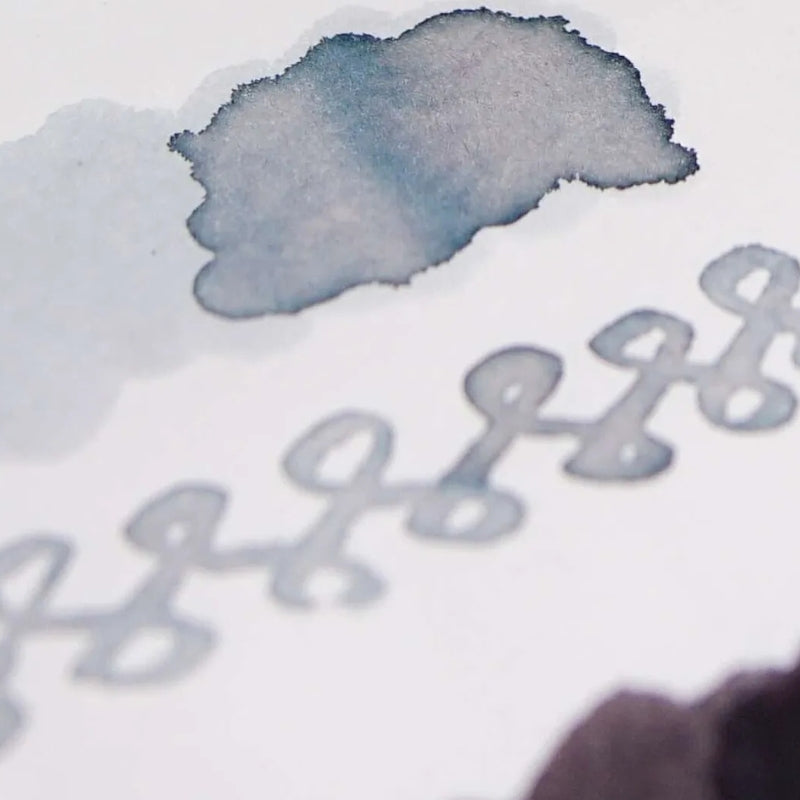 This is a soft, dusk-grey ink with a gentle wash of teal in its shadows. In heavier layers it deepens into a moody blue-green, while lighter strokes settle into a pale fog-grey that feels airy and understated on the page. The shading moves quietly between tones, giving writing a calm, rested softness — like the last light slipping across a room at the end of the day.
