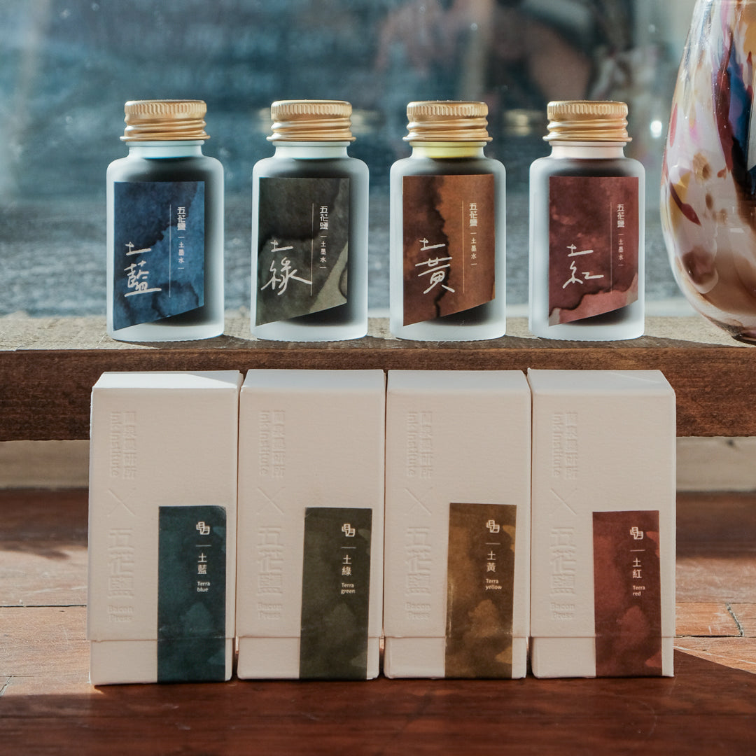 Terra Green 土綠 is an earthy green with a calm, muted character. It sits between moss and stone, offering a soft wash of green that leans neither too bright nor too cool. In writing, it shades from a delicate pale green to a deeper, dusky tone, capturing the quiet stillness of foliage, shadow, and softened light.