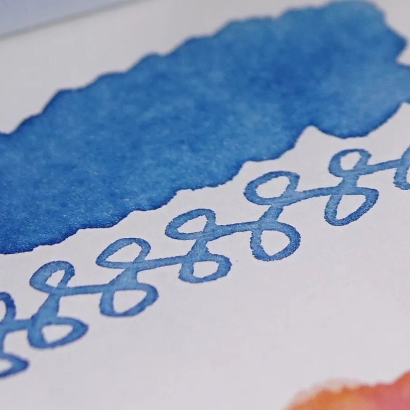 This is a bright, morning-blue ink with a playful violet cast. In heavier applications it pools into deep denim tones, while lighter strokes reveal soft purple shading that gives writing a lively, dimensional quality. The colour feels clean and cheerful on the page — crisp enough for everyday notes, yet expressive enough to add character to journaling or sketches.
