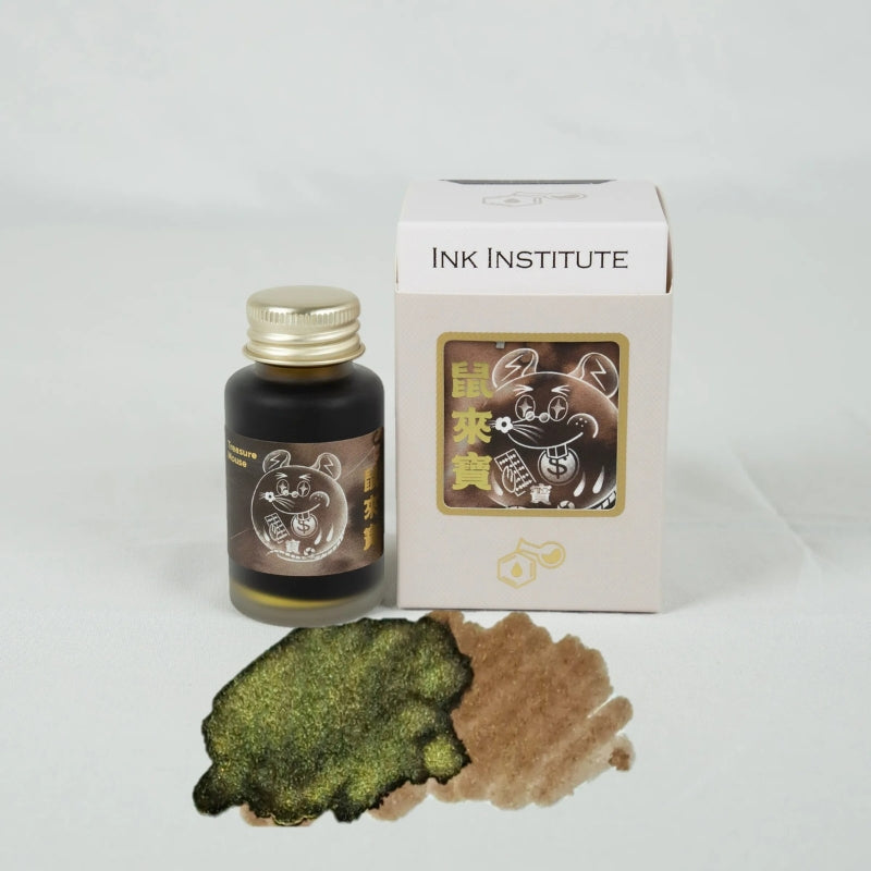 Zodiac: Treasure Mouse 鼠來寶 is a warm, earthy brown fountain pen ink touched with soft gold shimmer. Inspired by the Taiwanese “money mouse” (咬錢鼠), a symbol of prosperity and good fortune, this colour carries the spirit of abundance and small treasures kept safe. The label features a cheerful mouse holding a gold coin and scroll, blending charm with traditional symbolism.