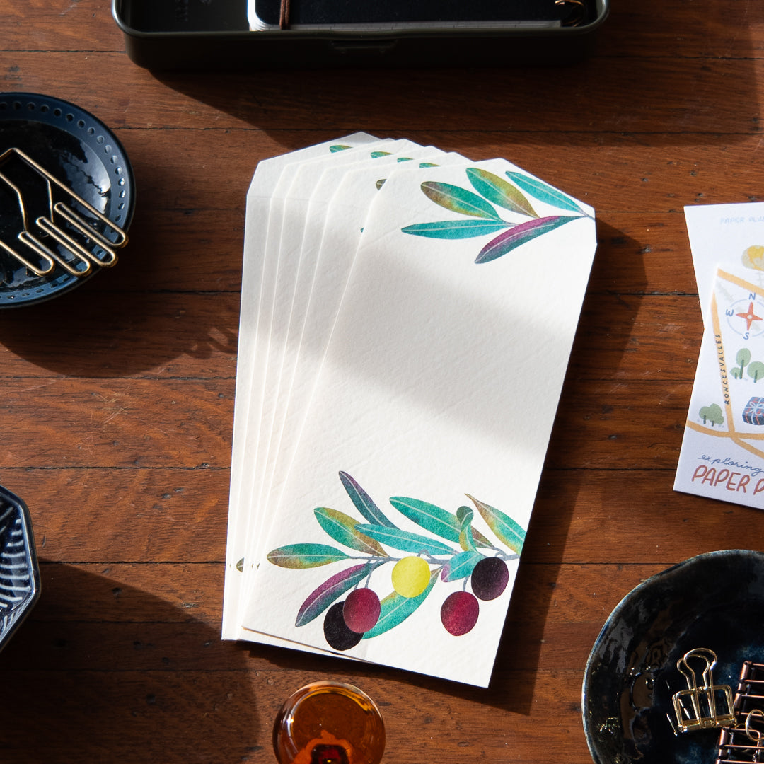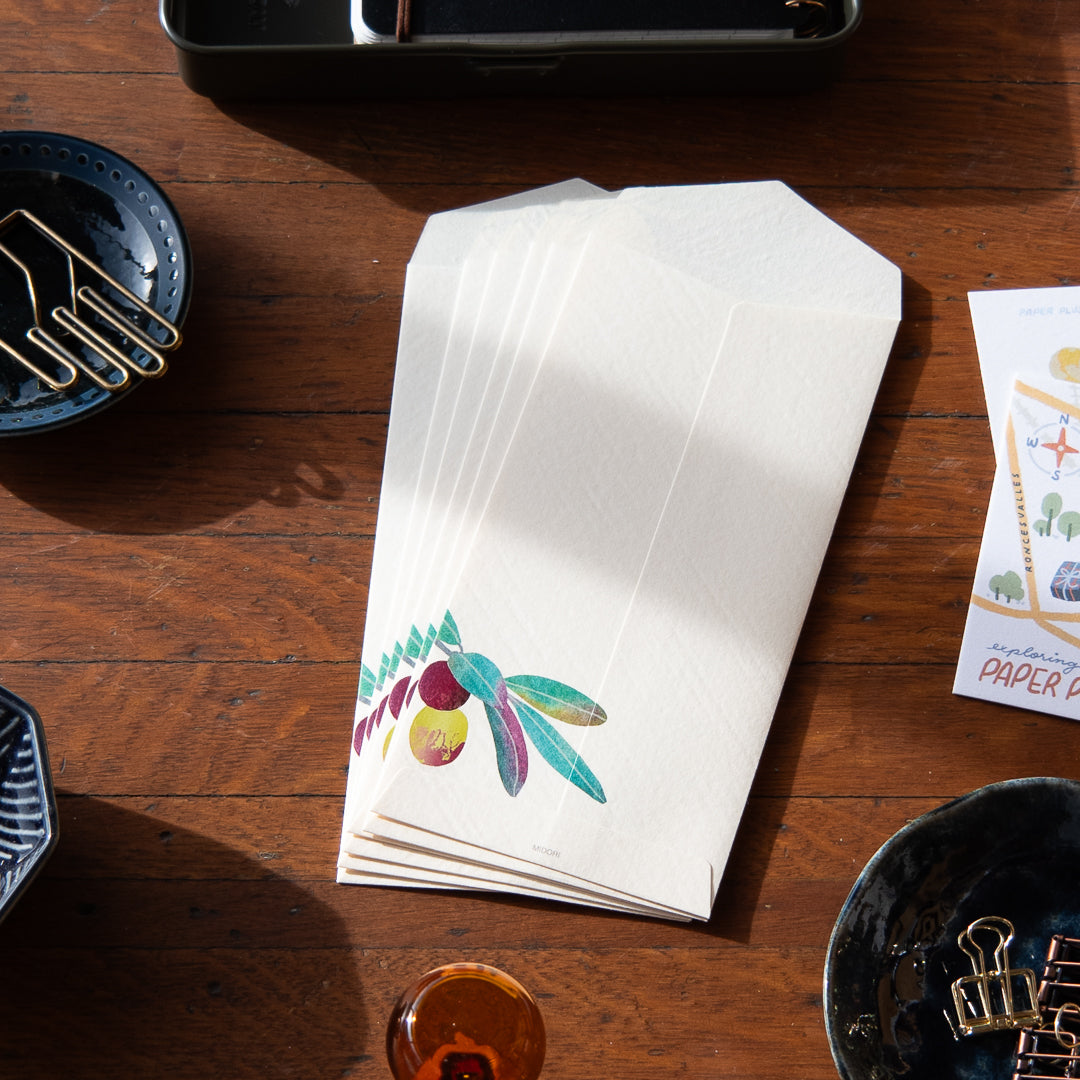 Part of Midori’s beloved Kami Series, celebrating the expressive beauty of traditional Japanese paper. Inspired by the deep, calming tones of autumn, this envelope features ripening olive branches rendered in transparent foil stamping. The subtle gloss catches the light softly, adding dimension without overpowering the design.