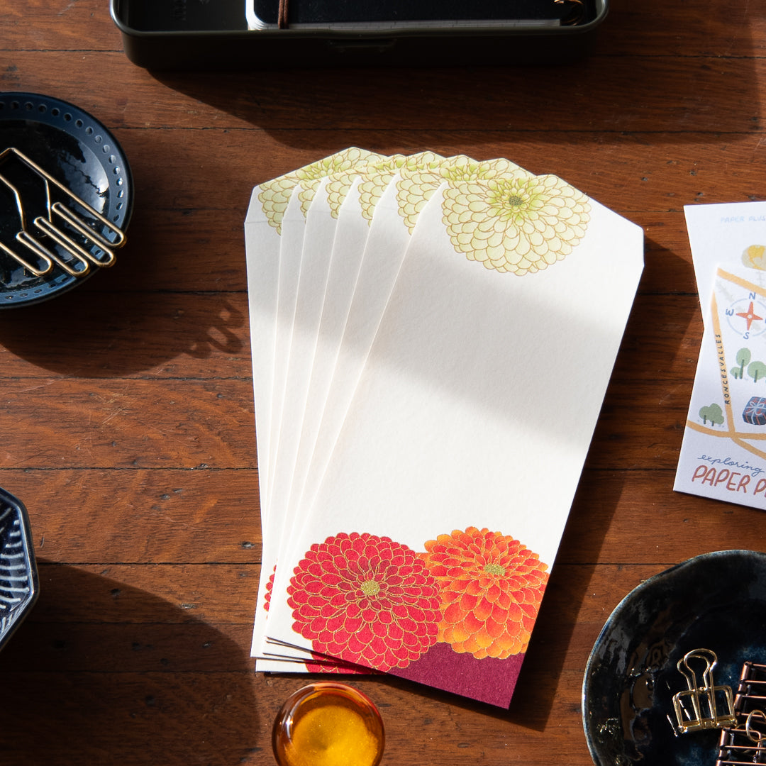 Part of Midori’s beloved Kami Series, celebrating the expressive beauty of traditional Japanese paper. This design features rounded pompon chrysanthemums rendered in rich autumnal tones, with delicate gold silk printing applied to each individual petal. The subtle metallic accents add warmth and dimension while preserving a calm, balanced composition.