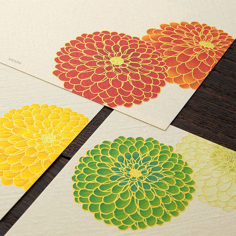 Part of Midori’s beloved Kami Series, celebrating the expressive beauty of traditional Japanese paper. This design features rounded pompon chrysanthemums rendered in rich autumnal tones, with delicate gold silk printing applied to each individual petal. The subtle metallic accents add warmth and dimension while preserving a calm, balanced composition.