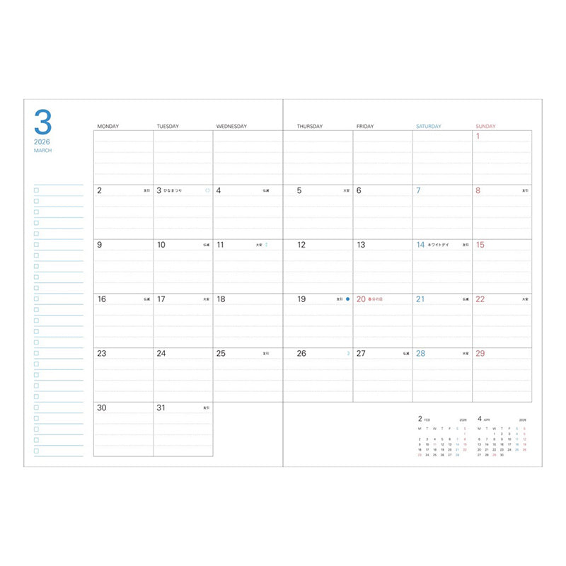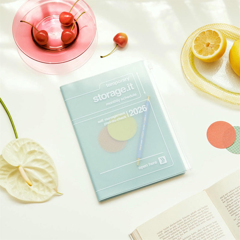 The Storage.it 2026 Monthly Block Planner (A5, December start) is a long-time favorite, known for its clear PVC zip cover that can hold tickets, notes, photos, or small stationery items. Marking its 20th anniversary, this edition continues to evolve beyond simple scheduling into a tool for carrying your inspirations and personal style. The 2026 lineup introduces new Brown and Pink colorways alongside its classic simplicity, offering a versatile look that suits every setting.