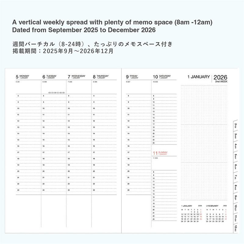 A clean, travel-ready take on the long-running Storage.it series, this overseas edition pairs the signature slide-zip pocket cover with a spacious A5 vertical layout. Thoughtfully made with non-phthalate PVC and FSC-certified NEO AGENDA paper, it balances sustainability with everyday function. The 16-hour vertical grid keeps your week clear at a glance, while memo spaces and monthly blocks support planning across multiple time frames.