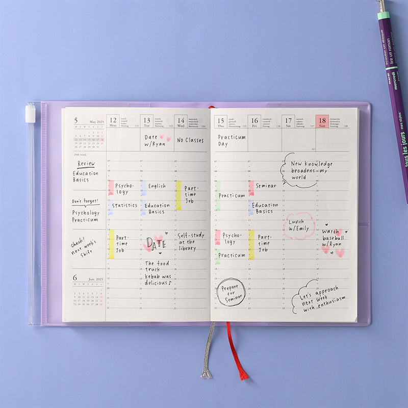 A compact, travel-ready take on the long-running Storage.it series. This overseas edition pairs the signature slide-zip pocket cover with a clear, 16-hour vertical layout from 7 a.m. to midnight—ideal for time-blocking busy days in a portable A6 size. Thoughtfully made with non-phthalate PVC and FSC-certified NEO AGENDA paper, it balances sustainability with everyday function. The 16-hour vertical grid keeps your week clear at a glance, while memo spaces and monthly blocks support planning across multiple time frames.