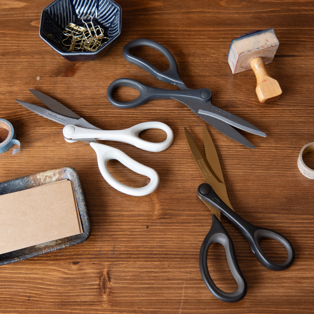 Winner of the GoodDesign Award in 2014, the Swingcut is like the Pencut's older sibling. Engineered by shifting the fulcrum away from the center, it causes the scissors to behave more similarly to a knife where the blades cut more with a pulling action instead of a pushing action with traditional scissors. This makes cutting thin and thick papers much easier and more accurate.