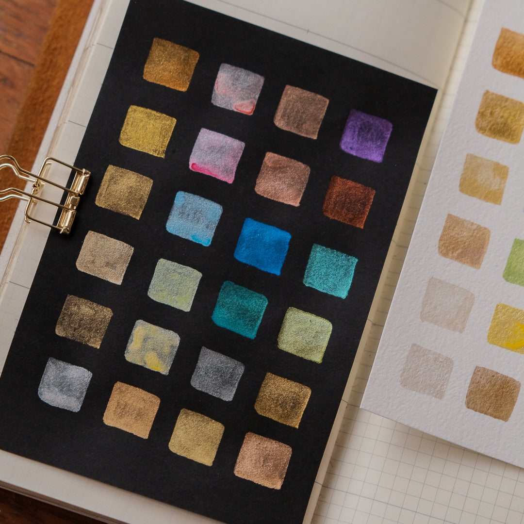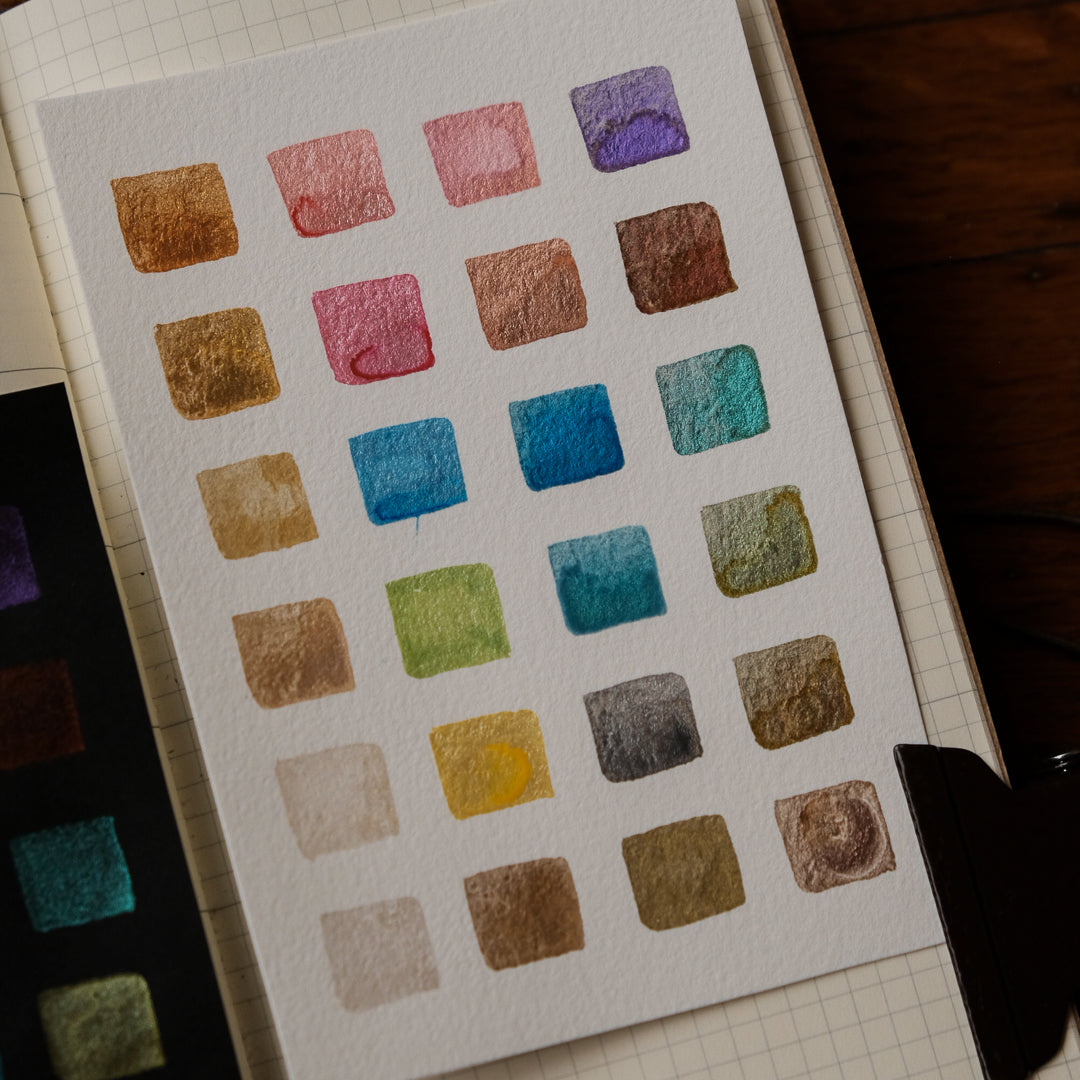 Depending on how much water you use, these colours can be applied thick and opaque, similar to gouache, or diluted into transparent, watercolour-style washes. Each colour comes in its own removable pan, allowing you to rearrange the set to suit your workflow. Ideal for painting, illustration, journaling, calligraphy details, and mixed media work, this set adds dimension and quiet impact whether used for delicate highlights or expressive layers.