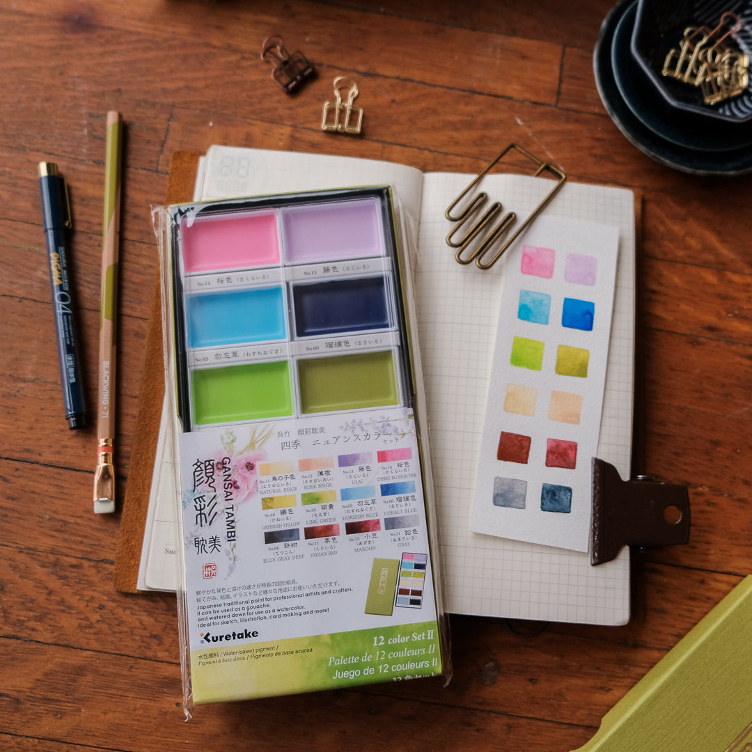 Introducing the Kuretake Watercolour Gansai Tambi Set 1 (12 colours) MC20/12V/NW, an exquisite collection of traditional Japanese watercolors. This set features 12 vibrant, richly pigmented colors that offer smooth application and excellent blendability, perfect for artists of all levels. Each color pan is generously sized and housed in a sleek, sturdy case, ensuring easy access and organization. The high-quality pigments deliver brilliant, long-lasting results on various surfaces, making this set ideal for detailed illustrations, calligraphy, and broad washes. Elevate your creative projects with the renowned quality and versatility of Kuretake Gansai Tambi watercolors.