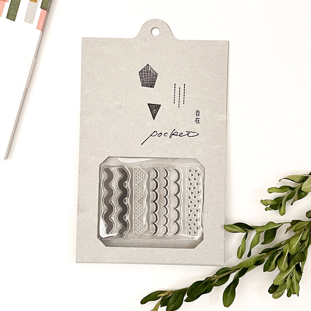 This is a set of mini clear polymer stamps from Mizushima - to be used with an acrylic block mount (not included). There are 3 pattern designs that can be stamped in a repeat fashion creating a much larger design!