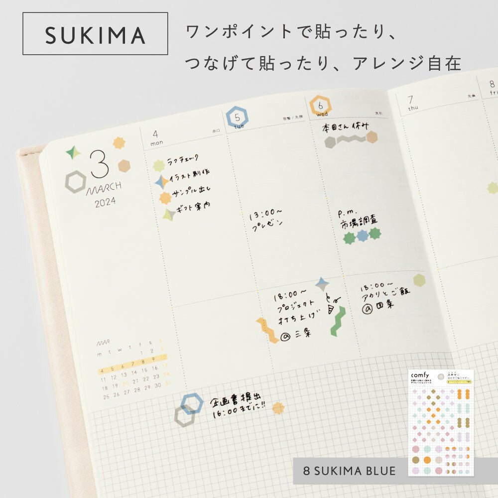 The comfy SUKIMA series offers smaller shapes and icons that are perfect for accenting text or filling the tiniest gaps in your planner. Made with softly translucent tracing paper, they can be layered over dates, lines, or writing to highlight notes without overwhelming the page. Whether used individually, grouped together, or combined across colors, these stickers make it easy to add playful accents and brighten your schedule. Available in Blue, Pink, Yellow, and Orange, their portable size means they slip neatly into planner covers for decorating on the go.