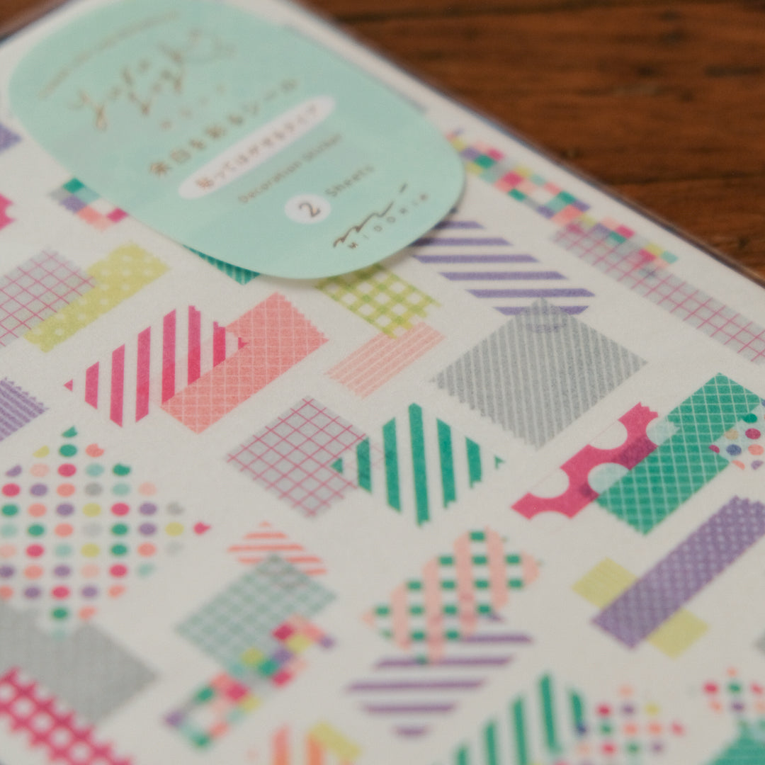 These decorative stickers make it easy to create a layered collage look, even without arranging multiple pieces. Featuring geometric shapes and motifs that resemble strips of tape, the designs are rendered in soft watercolor tones for a gentle, versatile effect. Their subtle colors complement any notebook or sticker set, adding interest without overwhelming your page.