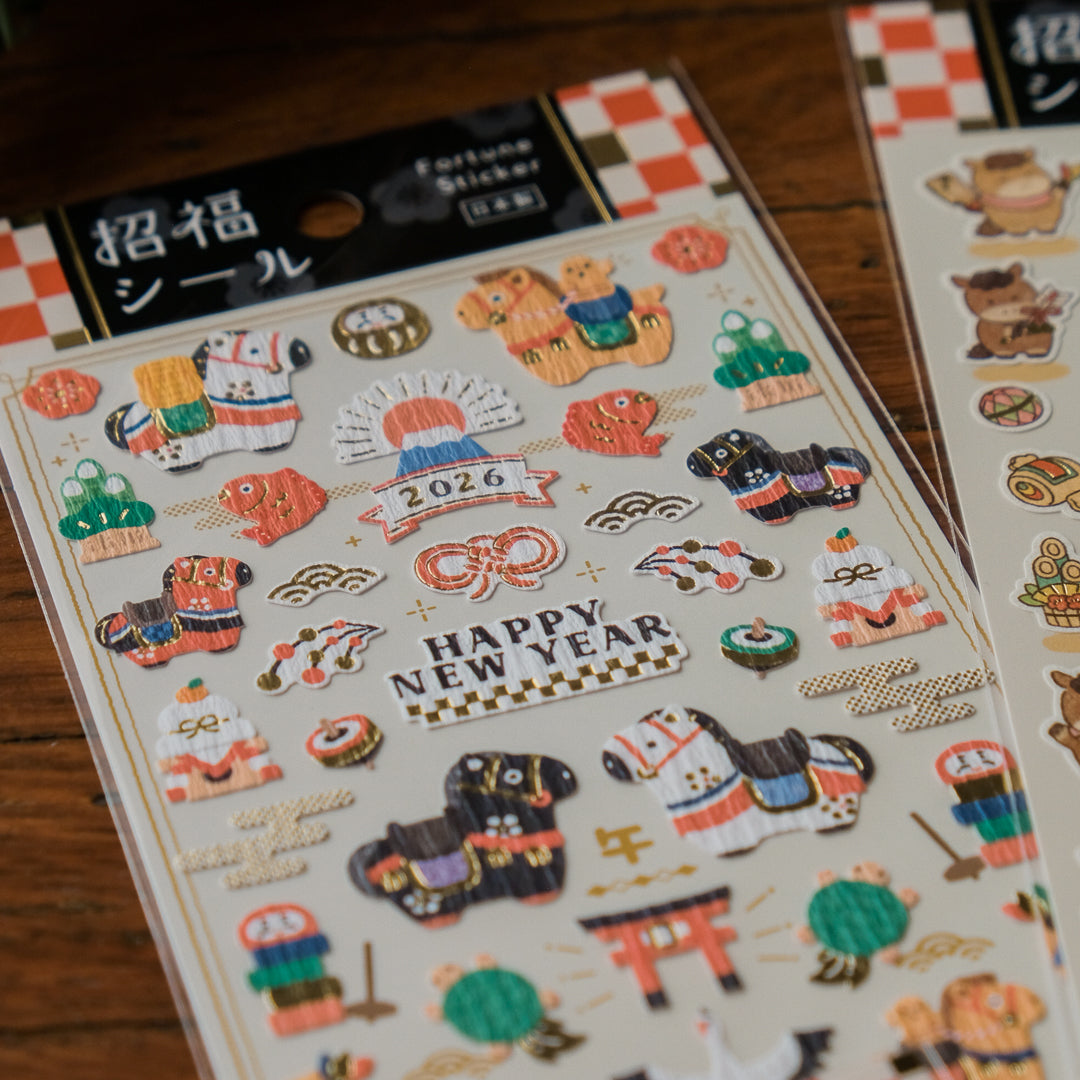 Celebrate the Year of the Horse with this playful and nostalgic sticker sheet, beautifully illustrated in soft tones and printed on delicate chirimen (Japanese crepe) paper. Featuring traditional toys, good luck symbols, and New Year’s greetings, this sheet adds a warm touch to seasonal letters, journals, or decorative projects.