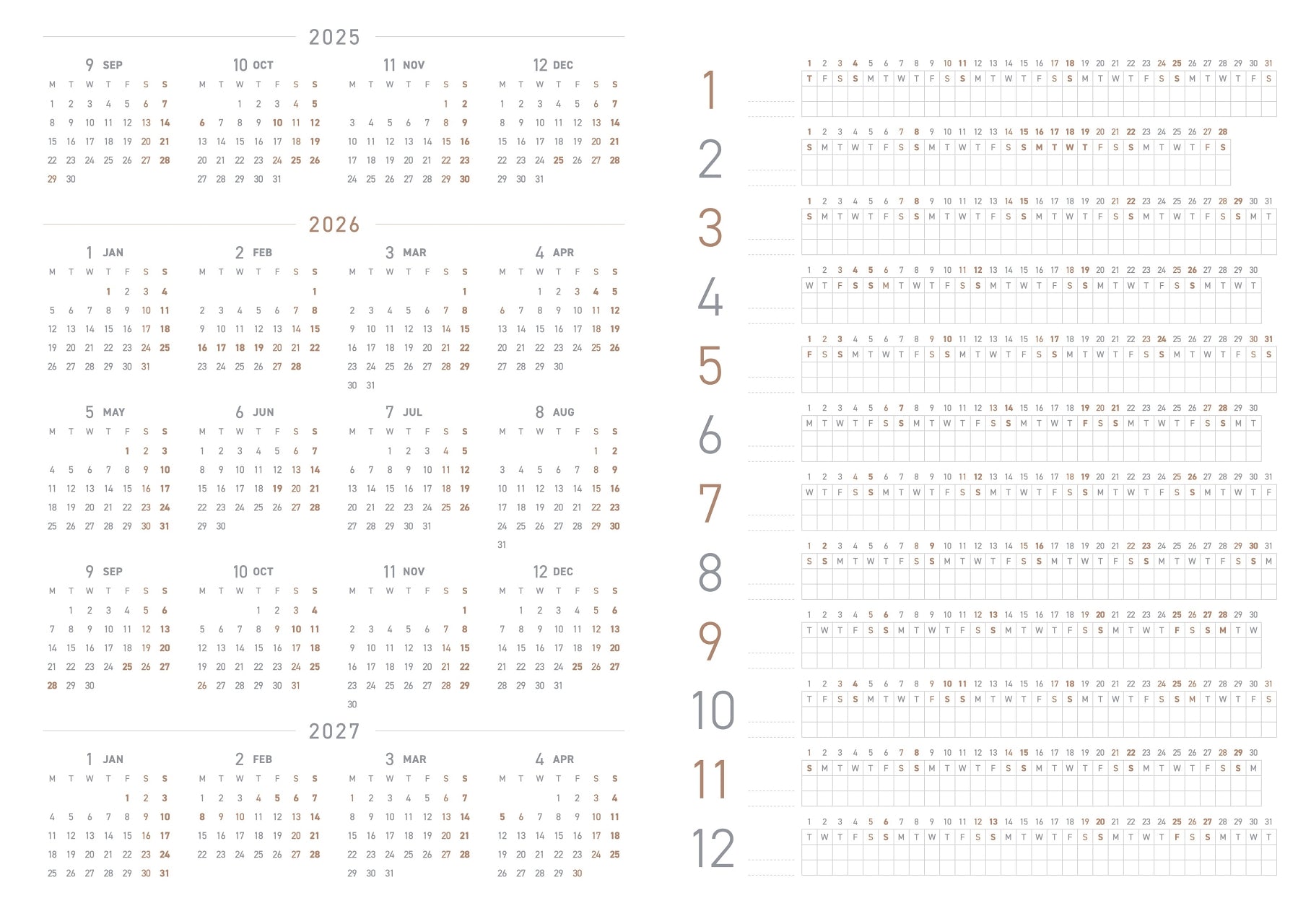 The horizontal Yearly Gantt chart (Jan - Dec) allows users to note important events (holidays, birthdays, etc.) or can be used for habit tracking.