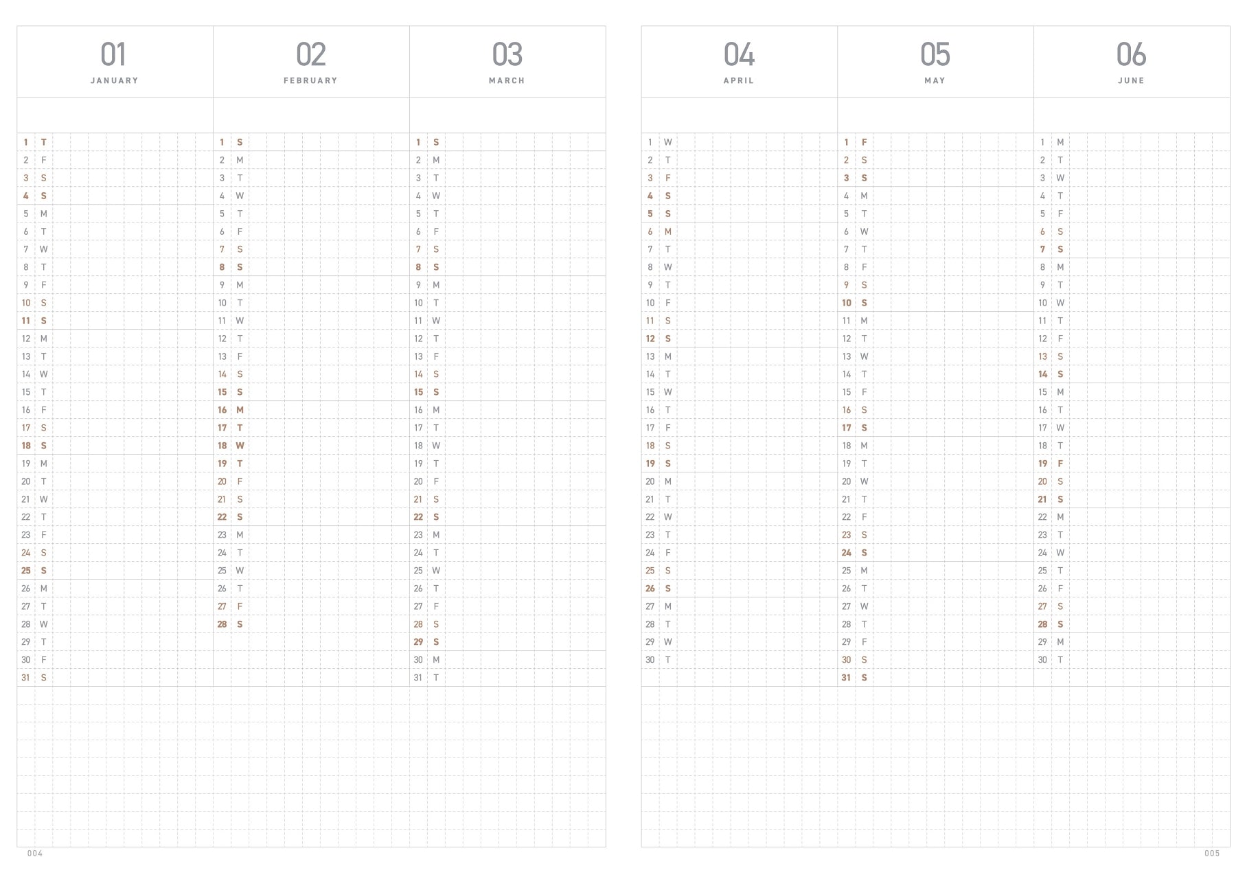 The vertical yearly plan gives you an overall view of the year. The vertical planner can be helpful for planning long-term projects, as well as a habit tracking table. Extra spacing are added at the bottom of this section to provide more space for notes.