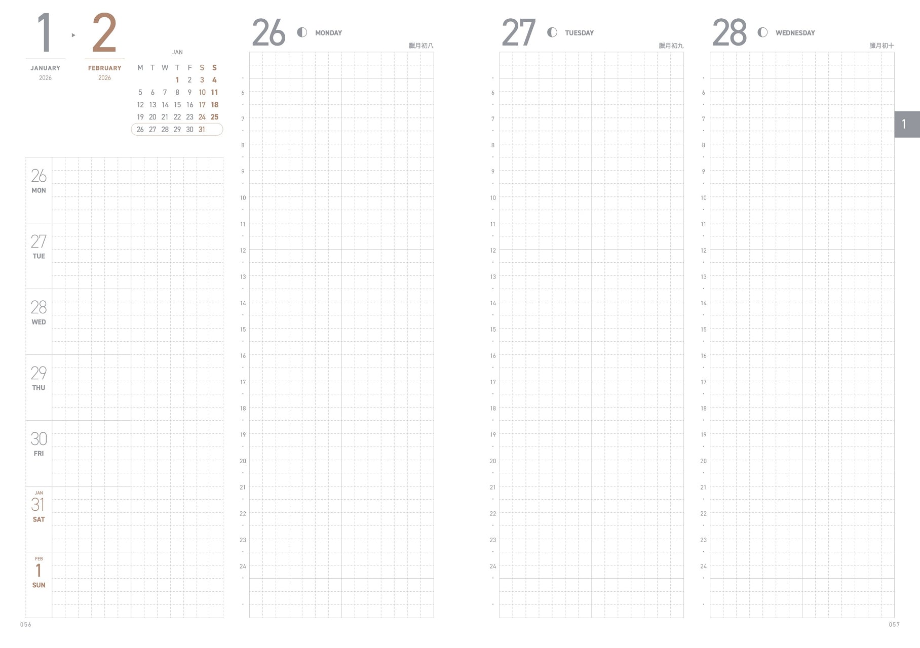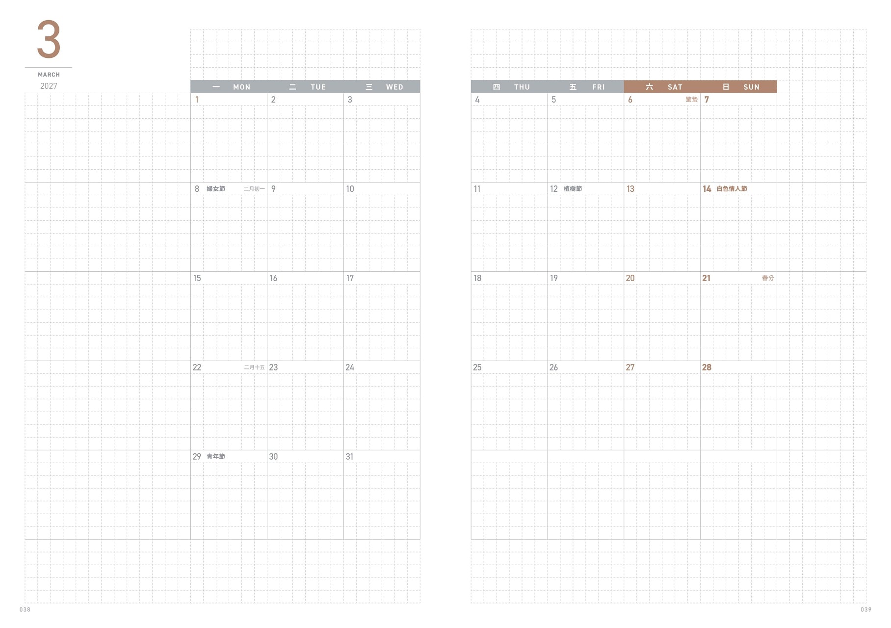 Includes Taiwan holidays, the monthly plan is in both Chinese and English, while the weekly plan displays English weekdays.