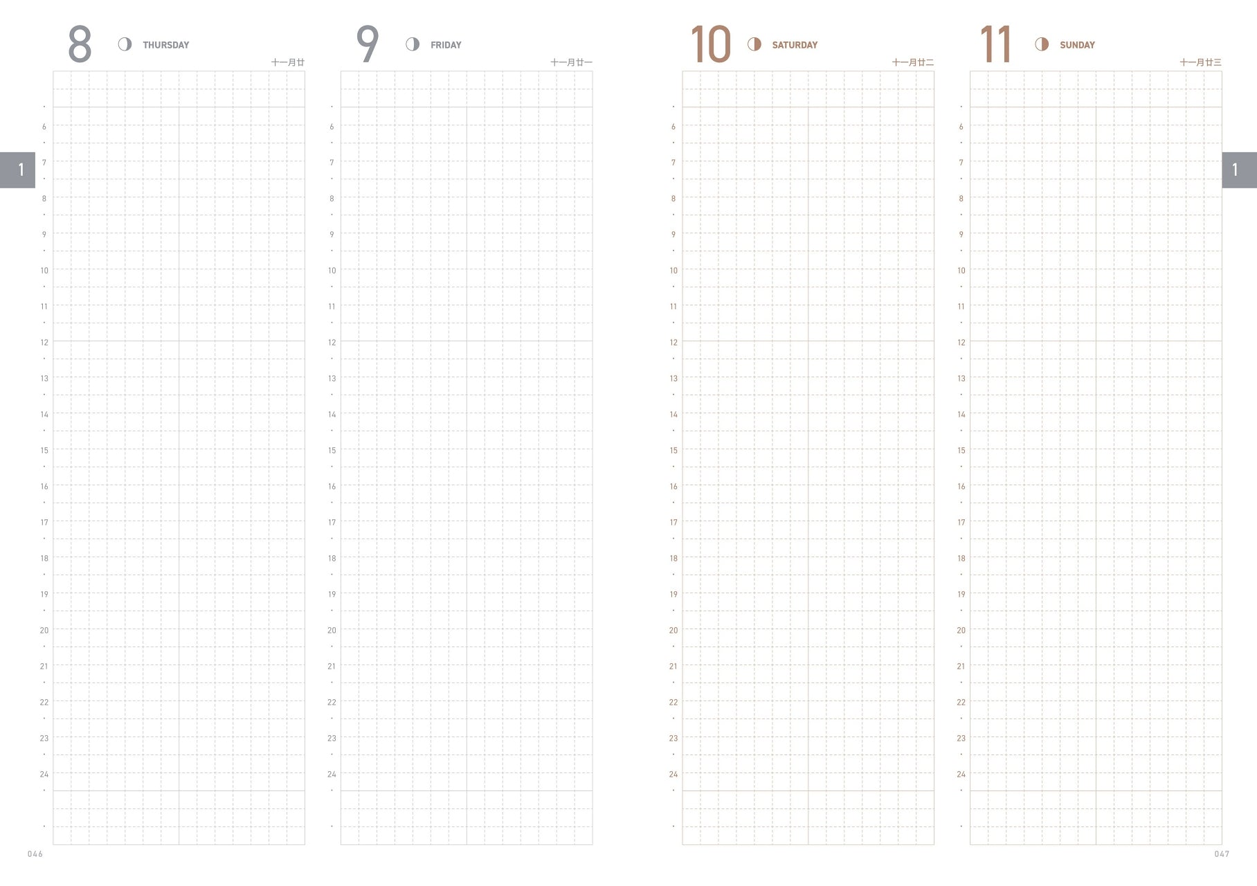 This layout allows you to view the week at a glance, and provides more space than a traditional vertical calendar to jot down to-dos and events. Each day includes a 24-hour vertical timeline (plus blank grid space at the top and bottom each day), and moon phases.