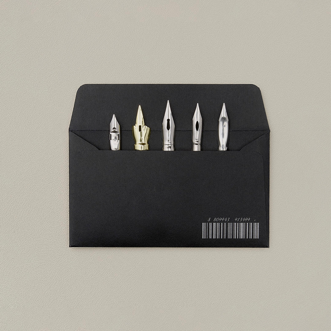 This elegant dip nib set from Wearingeul is a complimentary addition to the Wearingeul lineup. Inside a sleek black envelope sealed with wax, you’ll find five distinct nibs, each offering its own line variation and writing character.