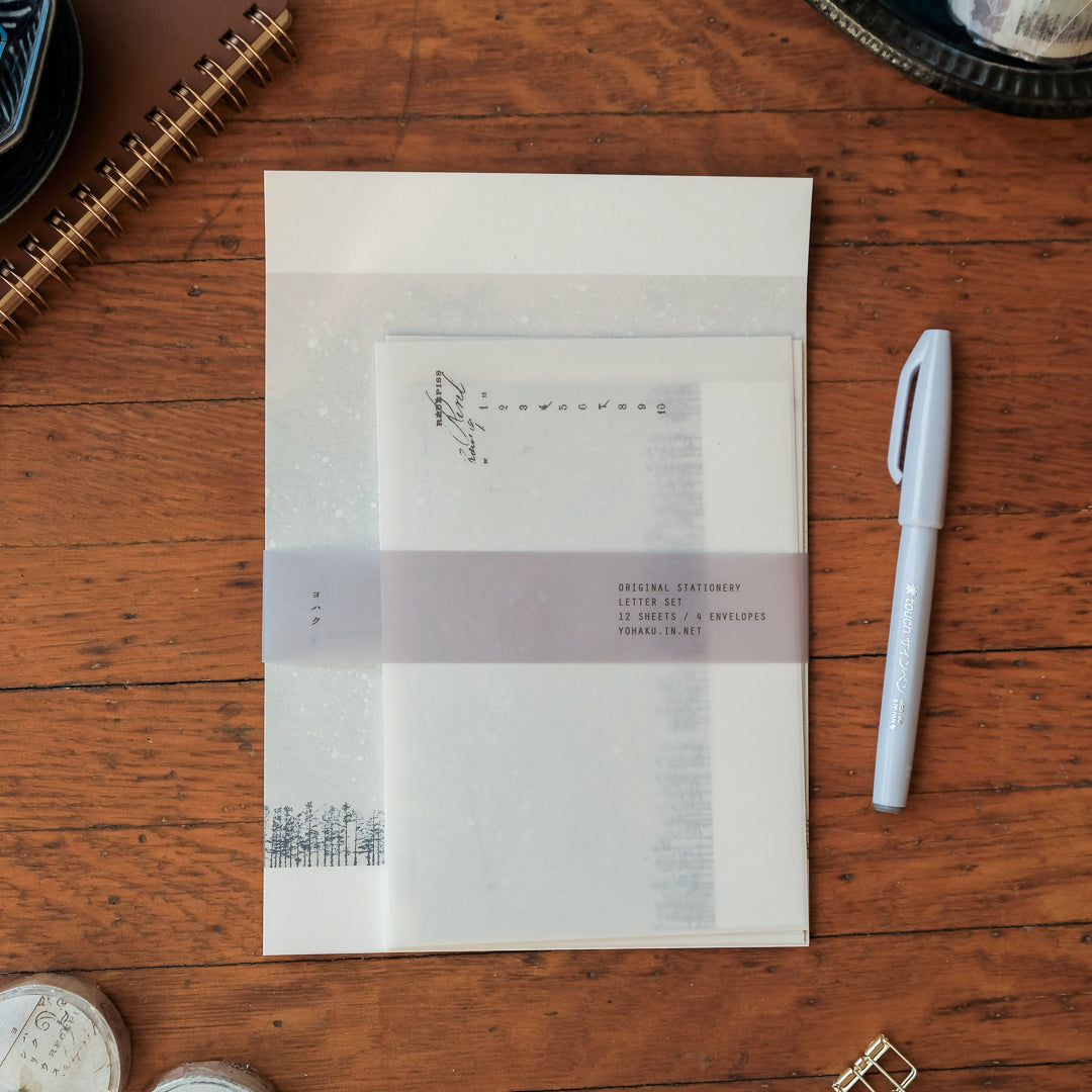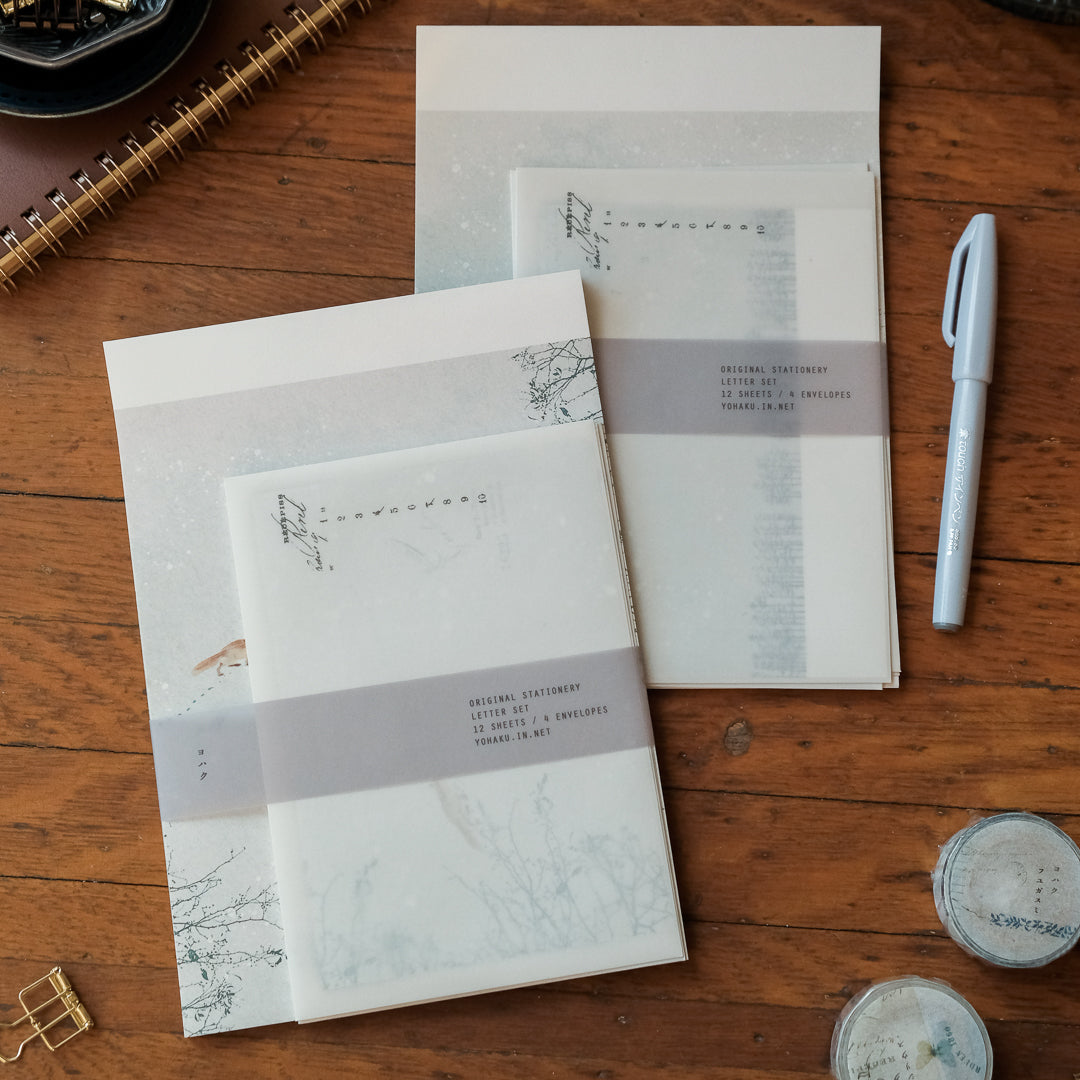 The set includes white waxed envelopes with a soft texture and gentle translucency unique to waxed paper. When the letter paper is folded and slipped inside, the layered designs subtly show through, adding a quiet detail that feels especially considered.