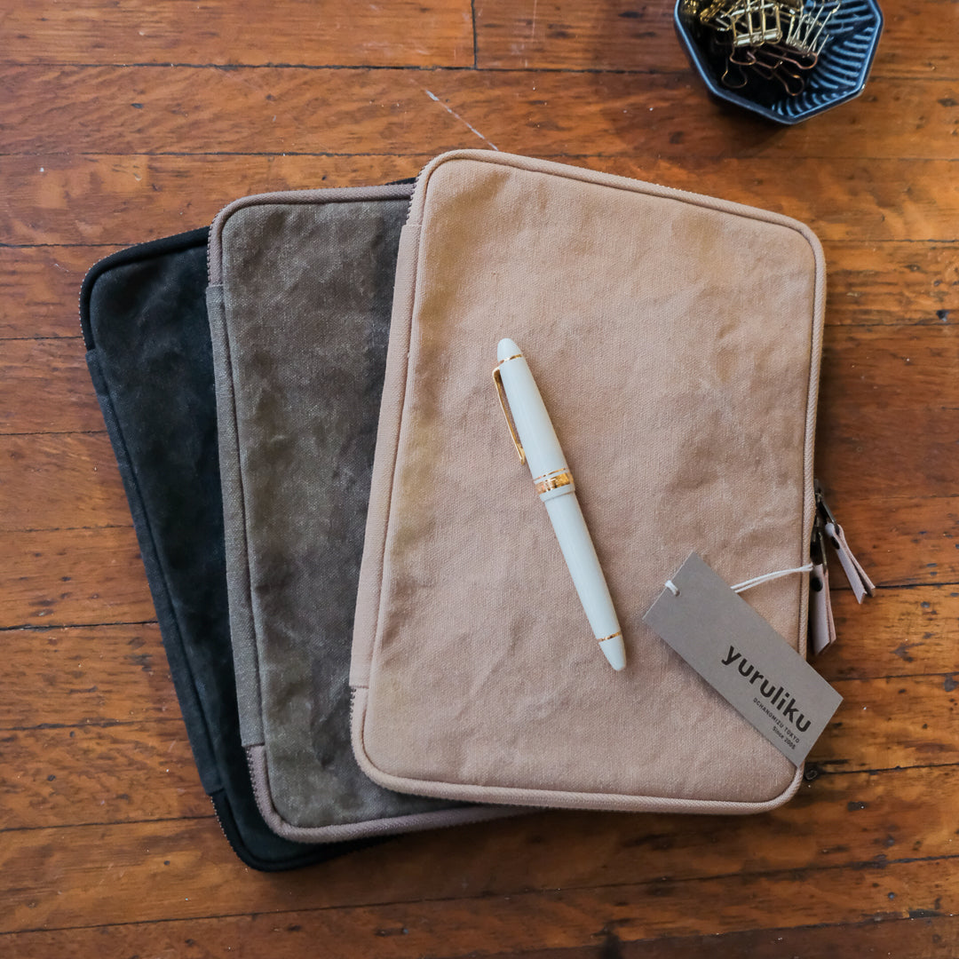 This is the FLAT Tool A5 Case in brown. It uses a high-quality tannin-dyed canvas that gets worn in the more you use it. The zipper opens in both directions from the center out to reveal the contents of your case. This houses a typical A5 notebook and other tools and supplies you may need. Zippers are #5 size YKK with leather tabs and most seam edges are enclosed for a clean finish. Can be carried around on it's own, or slip into a bag or briefcase while keeping your items sorted and protected.