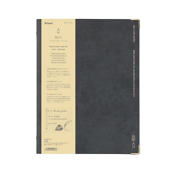 Elevate your note-taking with the stylish Kleid Fleek binder. The flexible synthetic leather cover is elegantly adorned with a gold embossed design in the lower right-hand corner and reinforced with gold-colored corners.