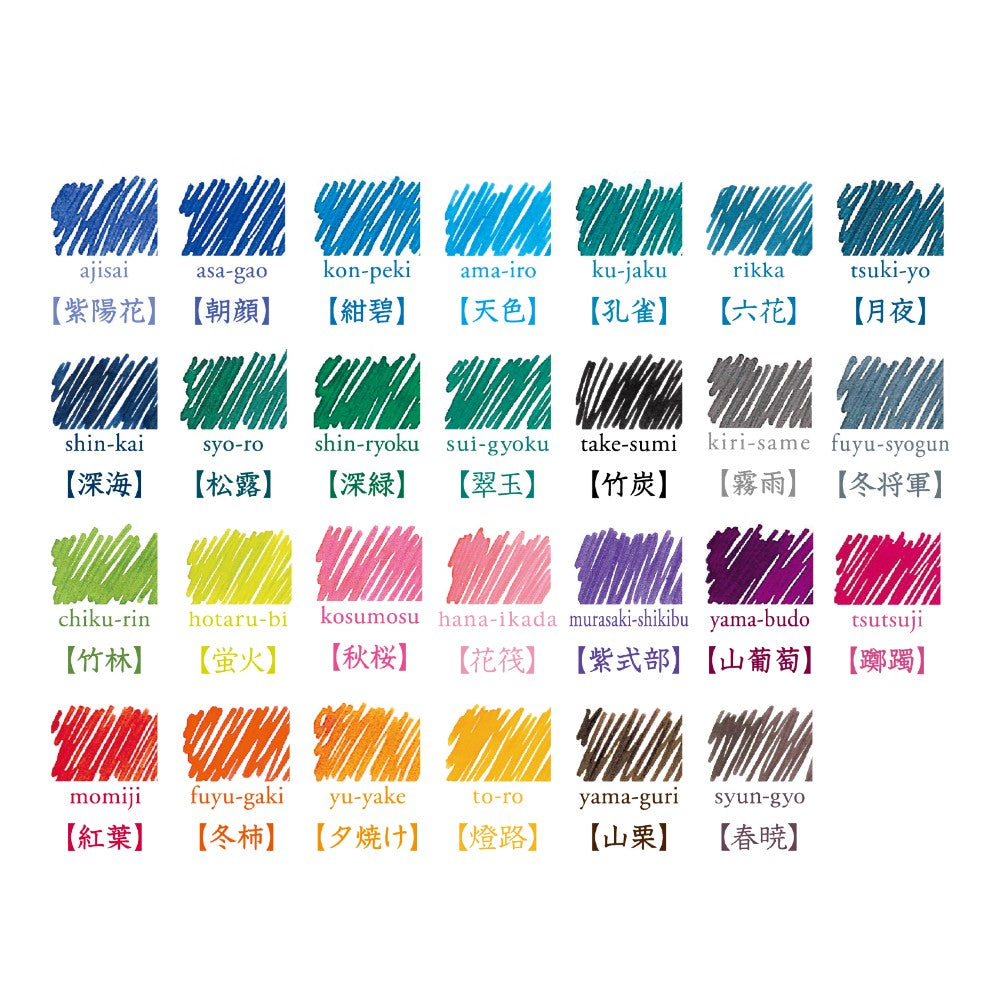 Created by Pilot Japan, the Iroshizuku (色彩雫・いろしずく) ink series celebrates the beauty of Japanese landscapes through rich, expressive colour. Each ink is inspired by a fleeting scene from nature—misty mornings, seasonal blooms, quiet water, or changing light—translated into carefully balanced hues designed to enhance the pleasure of writing.
